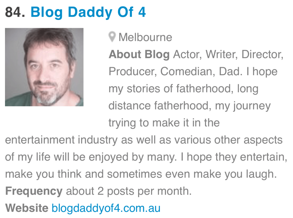 I got told about this a while ago. I was worried that my slackness this year may have moved me off the list. But guess what, I am sitting at number 84 in the world of dad bloggers according to Feedspots – Top 100 Father Blogs And Websites For Dads To Follow in 2018