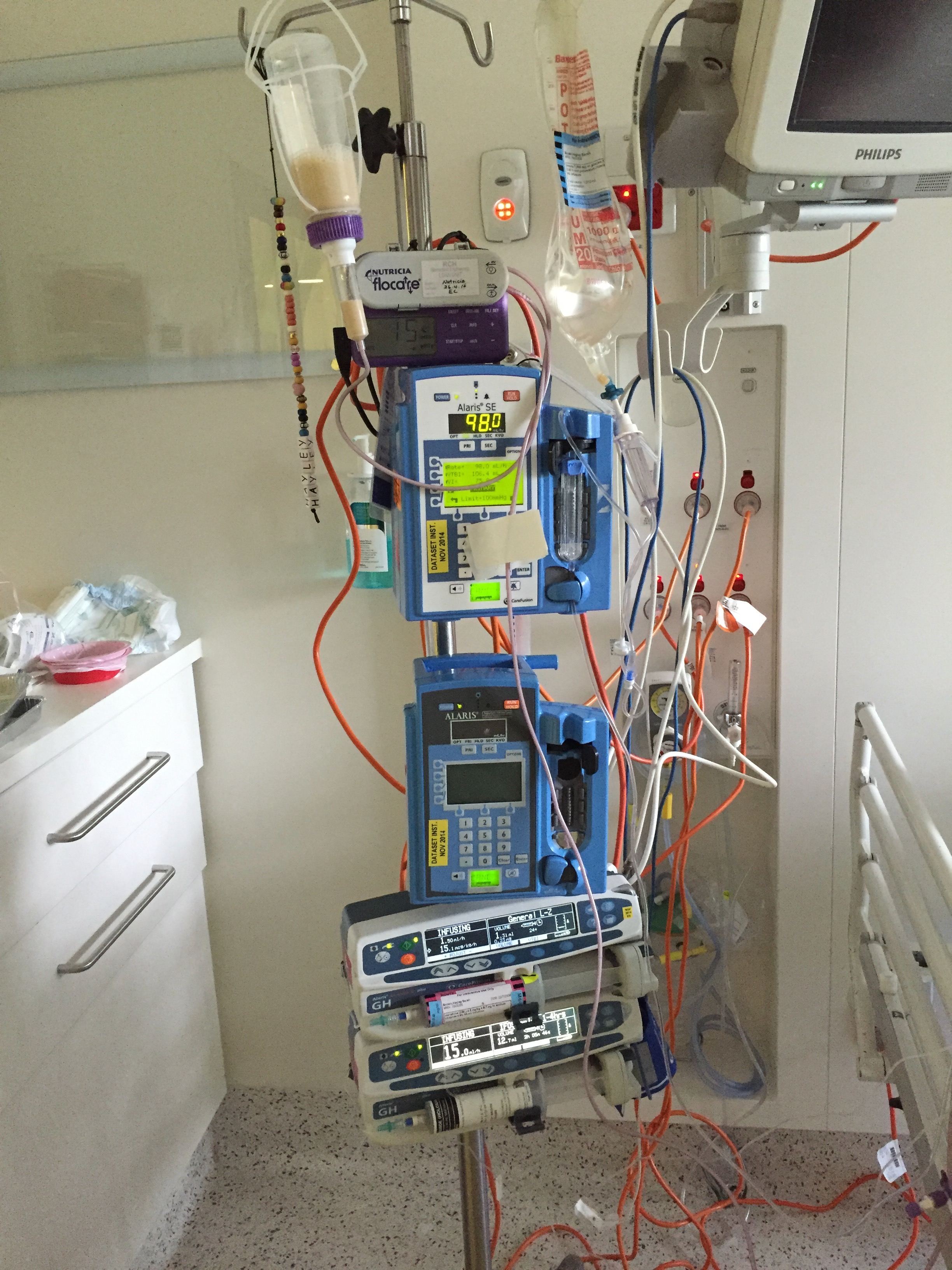You see a lot of cancer children with those little hoses going up their nose. That hose goes up their nose and down their throat to continually pump something like baby formula in to keep the nutrition up. Because of the location of Hayley’s tumour they couldn’t do that so they inserted a peg. Which means they had to operate and cut a hole in her stomach and put the hose through a hole near her belly button and pump this stuff directly into her stomach. These operations usually heal pretty quickly. The Gastro (team in charge of inserting pegs) person at Royal Children’s Hospital told us they heal quickly. A week late, with no healing, the Gastro person said that of course it isn’t healing, she’s on chemo. Then why did the first dickhead who visited us in the cancer ward say that it would? In hindsight, the healing process uses fast growing cells. FFS!
