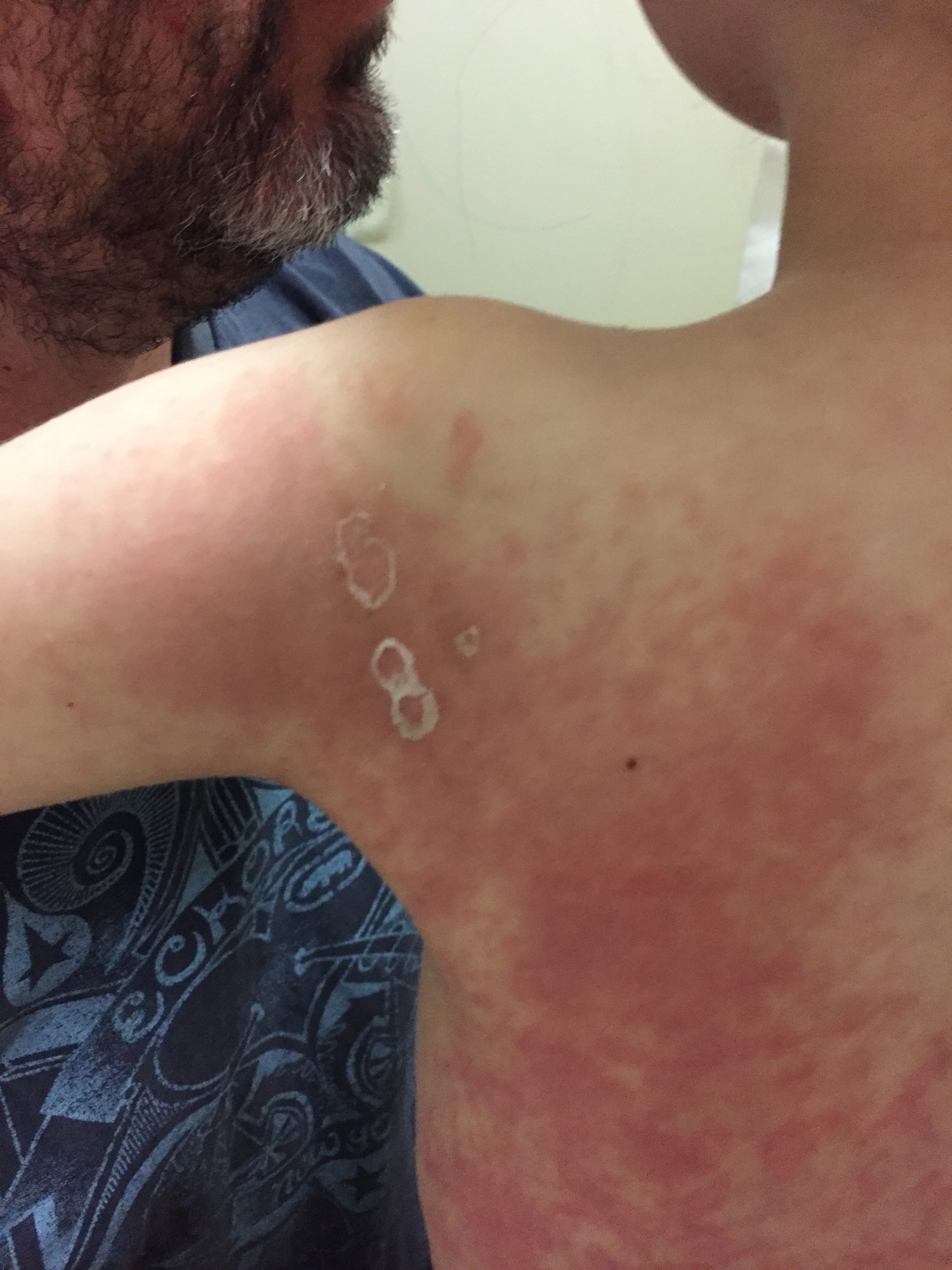This with the warning, make sure you be very careful not to get any of Hayley’s wee, saliva, sweat, etc. on your hands as it is full of chemo and it can burn your skin. Hayley got very sweaty one night. Her sweat was full of chemo. Her skin was burnt very badly. Here is a photo of her shoulder, not the worst part affected I’m afraid.