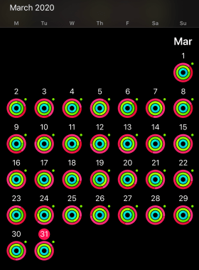 Now the Move Ring is the only one that be adjusted. The original plan was to burn 2,000 kilojoules (478 calories) and then put it up by 100 kilojoules (24 calories) on the 1st of every month. Well this month I have averaged 3083 kilojoules (737 calories) a day with the lowest day being 2137 kilojoules (511 calories) so I am putting it up to 2,500 kilojoules (598 calories) and will review again on the 1st of May. With a minimum of 100 kilojoules (24 calories).