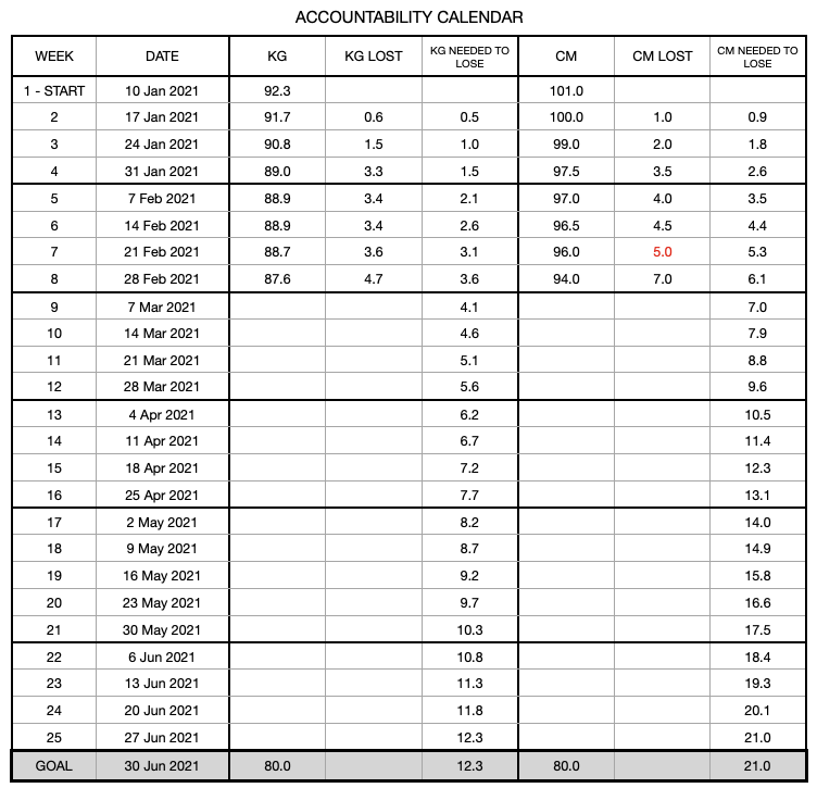Today, 28th February: Is 7 weeks later. Today 87.6kg/193 pounds and 94cm/37 inches waist. This last week I have worked the hardest but made the least difference. I’m putting it down to waking up some muscles and they’re adding weight.